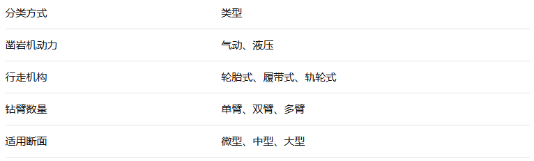 一台典型的掘进钻车由凿岩机、推进器、钻臂、车体与行走机构四大部分组成。它可搭载1至4台凿岩机同时作业,钻孔直径通常为25-64mm,孔深1-5.5m。