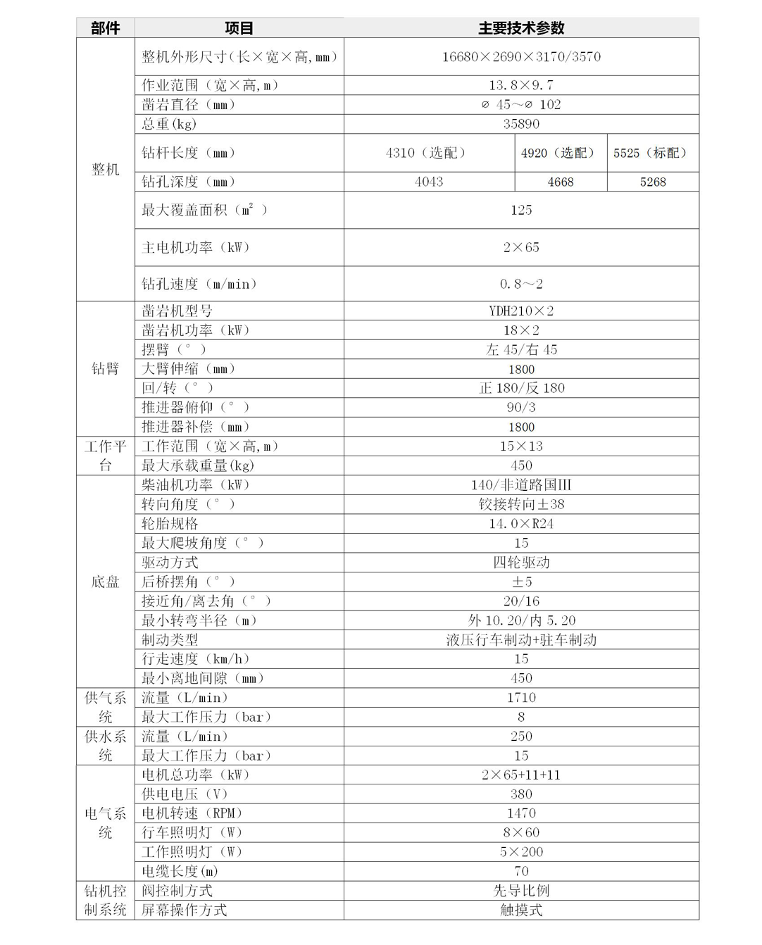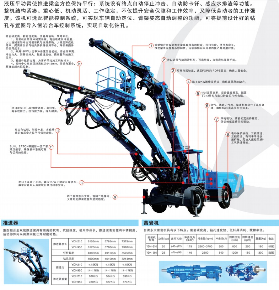 (2)采用18KW大功率冲击液压凿岩机,作业效率高、冲击力大、回转扭矩大,钻孔速度快,提高整车的施工效率;